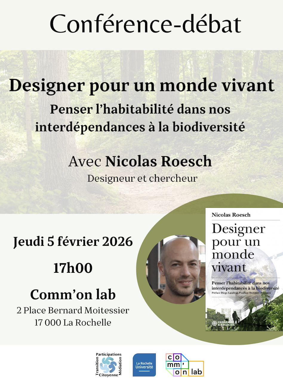 "Penser l’habitabilité dans nos interdépendances à la biodiversité" de Nicolas Roesch, designer et chercheur, autour de son ouvrage Designer pour un monde vivant – le 5 février au comm’on lab à partir de 17h.